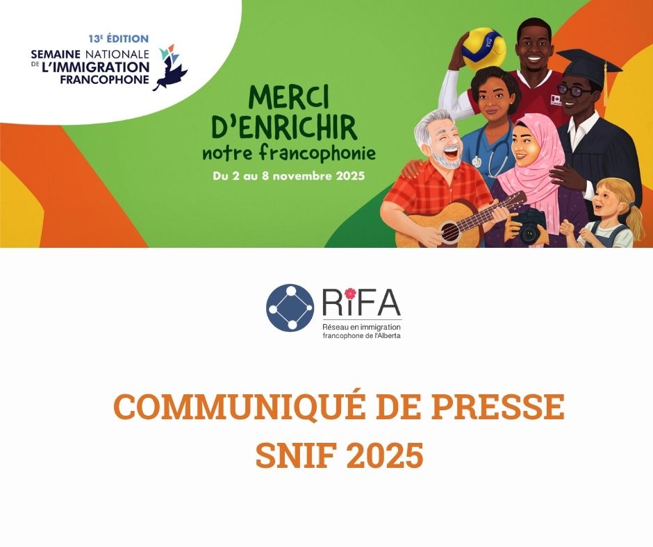 Edmonton, le 2 novembre 2024 – La 12ᵉ édition de la Semaine nationale de l’immigration francophone se tiendra du 3 au 9 novembre 2024 sous le thème « Notre héritage de demain ». En Alberta, le Réseau en Immigration Francophone de l’Alberta (RIFA) coordonne et promeut des activités diverses visant à rassembler les communautés locales et à célébrer l’apport des nouveaux arrivants francophones.